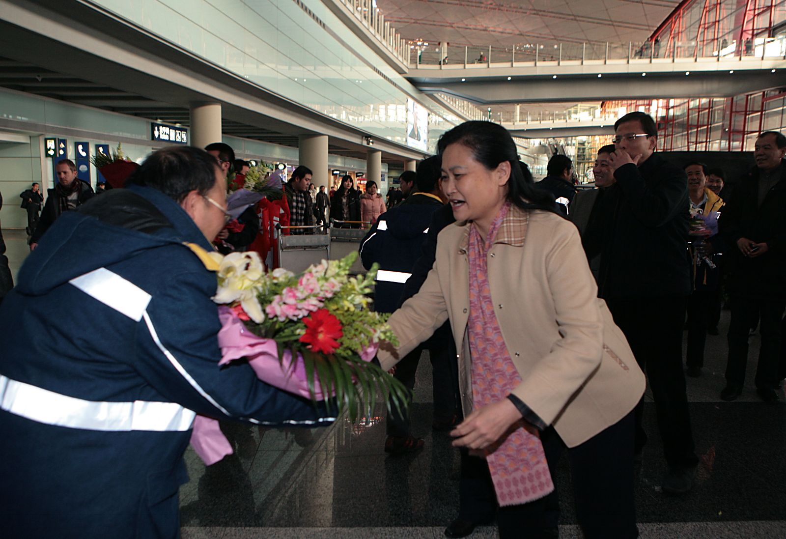 2月27日下午三点,集团公司总经理姚燕,党委副书记郝振华,副总经理马建国、黄安中,总经理助理兼国际部总经理卫锋等来到首都国际机场,迎接首批从利比亚回国的29名员工。