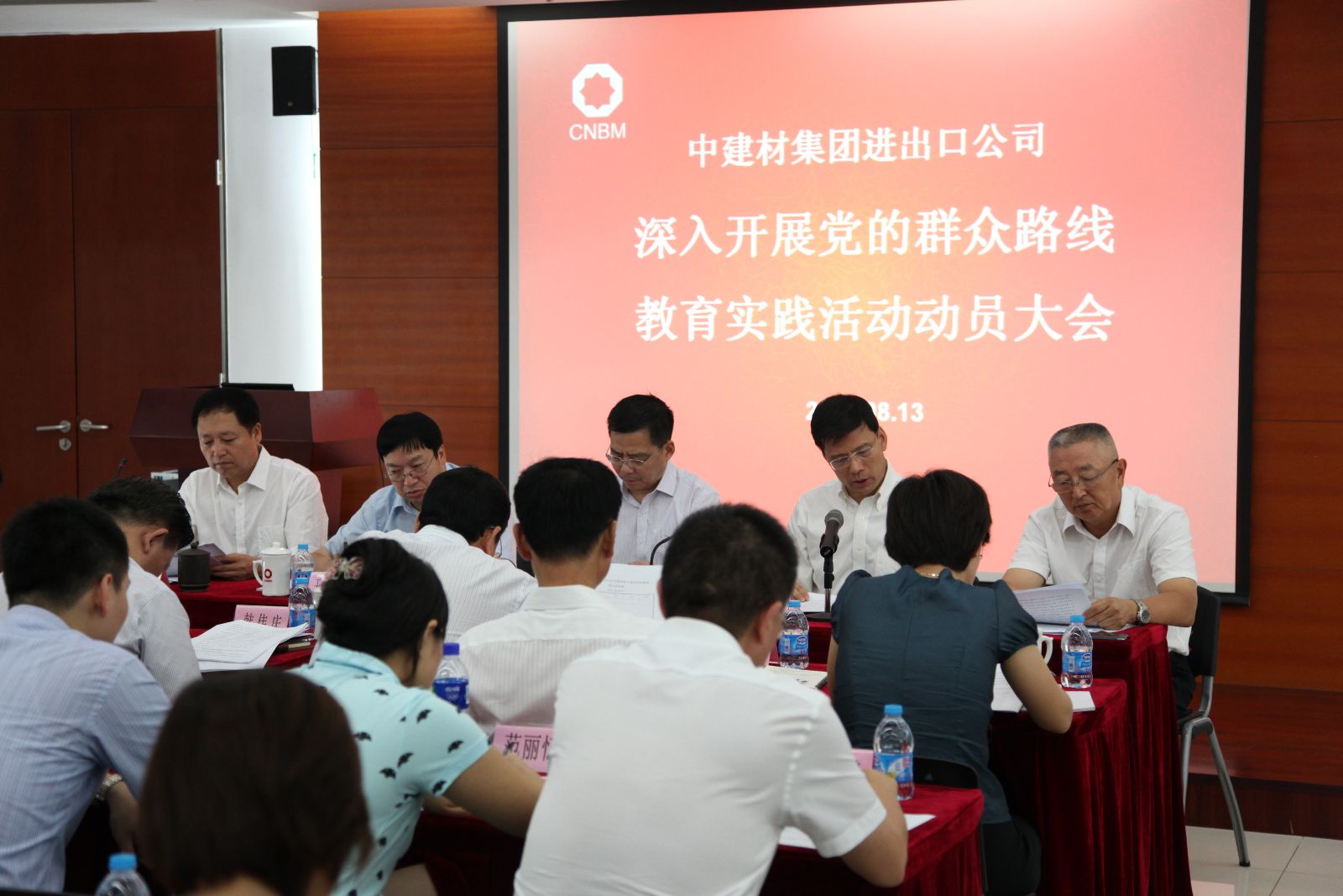 8月13日下午,中建材进出口召开深入开展党的群众路线教育实践活动动员大会,贯彻落实中央精神、国资委党委及集团党委要求,对公司党的群众路线教育实践活动进行动员部署。动员会上,公司党委书记、总经理黄安中同志代表公司党委作了动员讲话,公司党委副书记、纪委书记郭光明同志对公司深入开展党的群众路线教育实践活动实施方案和有关情况作了说明,集团公司第二督导组组长许金华同志作了重要讲话。会议由公司常务副总经理吴坚主持。集团第二督导组副组长王于猛及督导组其他成员出席了大会。公司领导班子成员,公司本部部门负责人、子公司领导班子及党政主要负责人,部分职工代表共53人参加了大会。